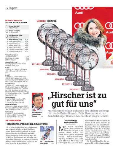 Marcel Hirscher holt sich auch den Slalom-Weltcup, hält bei 14 Kristallkugeln. Felix Neureuther streut dem Salzburger Blumen. Michael Matt siegt erstmals.