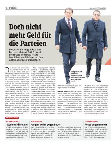 Die „Valorisierung“ hätte den Parteien ab April 5,65 Prozent mehr Geld gebracht. Heute beschließt der Ministerrat, den Automatismus auszusetzen.