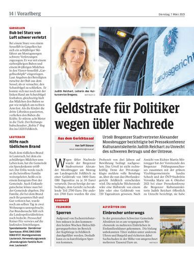 Urteil: Bregenzer Stadtvertreter Alexander Moosbrugger bezichtigte bei Pressekonferenz Kulturamtsleiterin Judith Reichart zu Unrecht des schweren Betrugs und der Untreue.