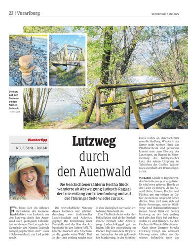Die Geschichtenerzählerin Hertha Glück wanderte ab Abzweigung Ludesch-Raggal der Lutz entlang zur Lutzmündung und auf der Thüringer Seite wieder zurück.