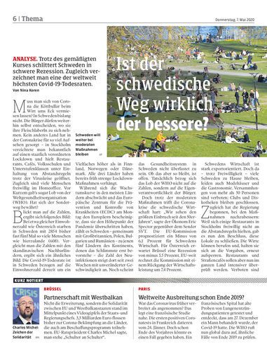 Eigenverantwortung. Schwedens Sonderweg in der Corona-Krise ist wiederholt Thema. Ist das eigenwillige Krisenmanagement des skandinavischen Landes wirklich besser? Die Zahlen sprechen dagegen. Seiten 6/7 APA/AFP