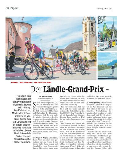 Für Sport-Fan Markus Linder ging vergangene Woche ein Traum in Erfüllung. Der Kabarettist, Moderator, Schauspieler und Musiker durfte den Rad-GP Vorarlberg in einem Begleitfahrzeug hautnah miterleben. Seine Eindrücke schildert er in einer Spezialausgabe seiner Kolumne.