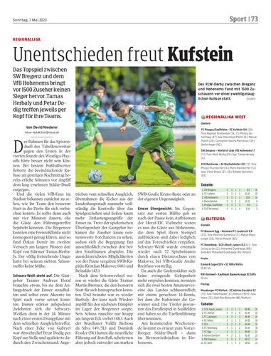 Das Topspiel zwischen SW Bregenz und dem VfB Hohenems bringt vor 1500 Zuseher keinen Sieger hervor. Tamas Herbaly und Petar Dodig treffen jeweils per Kopf für ihre Teams.