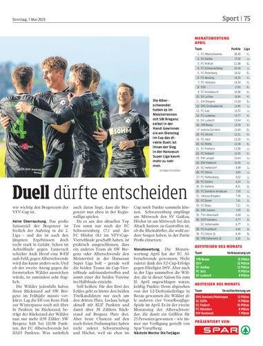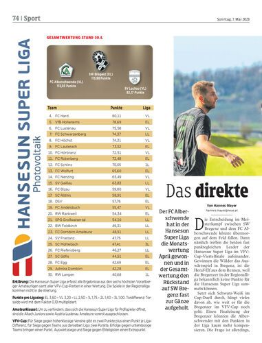 Der FC Alberschwende hat in der Hansesun Super Liga die Monatswertung April gewonnen und in der Gesamtwertung den Rückstand auf SW Bregenz fast zur Gänze aufgeholt.