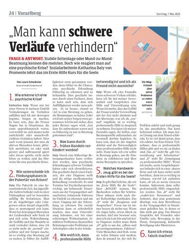 Frage & Antwort. Stabile Seitenlage oder Mund-zu-Mund-Beatmung kennen die meisten. Doch wie reagiert man auf eine psychische Krise? Sozialarbeiterin Katharina Daly von Promente lehrt das im Erste Hilfe Kurs für die Seele.
