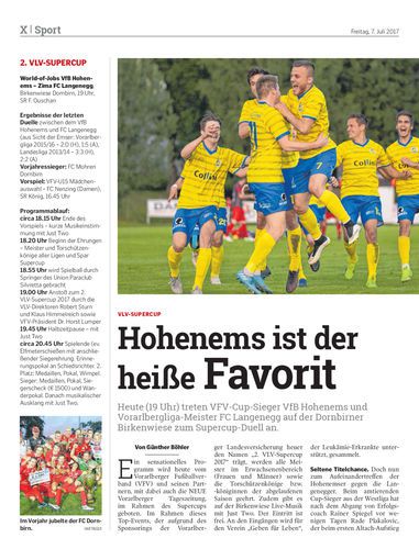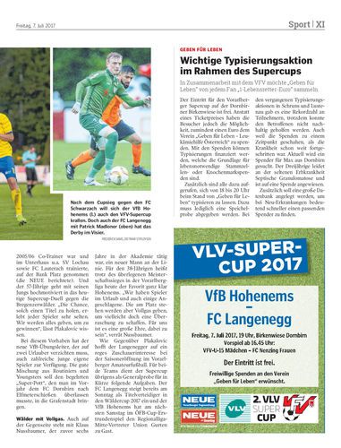 Heute (19 Uhr) treten VFV-Cup-Sieger VfB Hohenems und Vorarlbergliga-Meister FC Langenegg auf der Dornbirner Birkenwiese zum Supercup-Duell an.