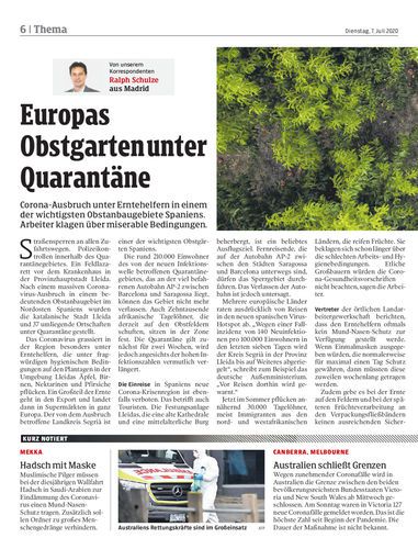 Corona-Ausbruch unter Erntehelfern in einem der wichtigsten Obstanbaugebiete Spaniens. Arbeiter klagen über miserable Bedingungen.