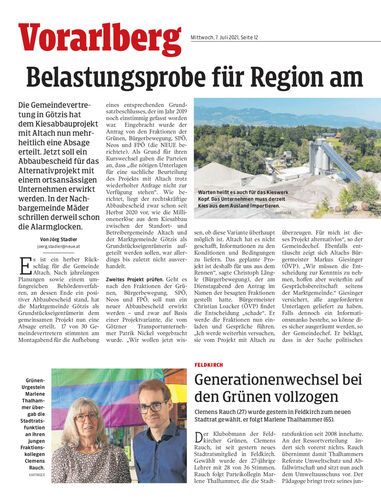 Die Gemeindevertretung in Götzis hat dem Kiesabbauprojekt mit Altach nun mehrheitlich eine Absage erteilt. Jetzt soll ein Abbaubescheid für das Alternativprojekt mit einem ortsansässigen Unternehmen erwirkt werden. In der Nachbargemeinde Mäder schrillen derweil schon die Alarmglocken.