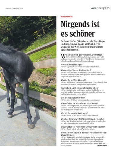 Gerhard Höfler (53) arbeitet als Tierpfleger im Doppelmayr-Zoo in Wolfurt. Gerne würde er die Welt bereisen und mehrere Sprachen lernen.