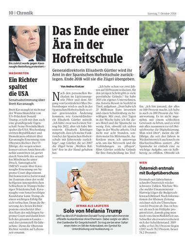 Generaldirektorin Elisabeth Gürtler wird ihr Amt in der Spanischen Hofreitschule zurücklegen. Ende 2018 will sie die Zügel übergeben.