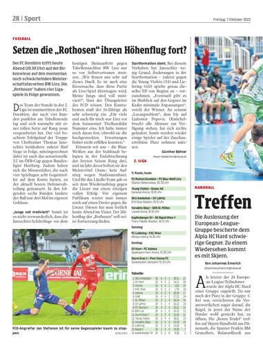 Der FC Dornbirn trifft heute Abend (20.30 Uhr) auf der Birkenwiese auf den momentan noch schwächelnden Meisterschaftsfavoriten BW Linz. Die „Rothosen“ haben vier Ligaspiele in Folge gewonnen.