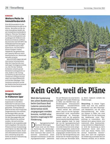 Weil die Sanierung des alten Badehauses beim Gasthaus Bad Laterns unverschuldeterweise nicht angegangen werden konnte, verfällt eine bereits zugesagte EU-Förderung.
