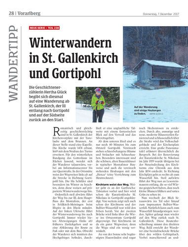 Die Geschichtenerzählerin Hertha Glück begibt sich diesmal auf eine Wanderung ab St. Gallenkirch, der Ill entlang nach Gortipohl und auf der Südseite zurück an den Start.