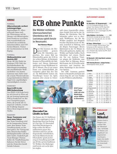 Die Wälder verlieren überraschend bei Gherdeina mit 3:4. Lustenau spielt heute in Neumarkt.