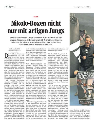 Beim traditionellen Kampfabend des BC Dornbirn in der Zeit um den Nikolaustag klettern heute ab 19 Uhr in der Schorenhalle nun doch Boxer aus mehreren Nationen in den Ring. Große Trauer um Wiener Daniel Nader.