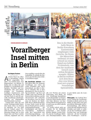 Den in die Markthalle Neun in Berlin-Kreuzberg Eintretenden empfangen viele Gerüche. Im Strom der Menschen treibend, ist man schnell an einem Stand aus hellem Fichtenholz, von dem der markante Geruch nach reifem Bergkäse ausgeht. Mitten in Berlin eröffnet sich dem Besucher eine kleine Insel mit original Vorarlberger
