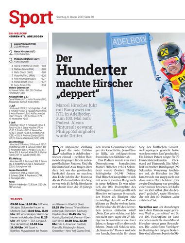 Marcel Hirscher fuhr mit Rang zwei im RTL in Adelboden zum 100. Mal aufs Podest. Alexis Pinturault gewann, Philipp Schörghofer wurde Dritter.