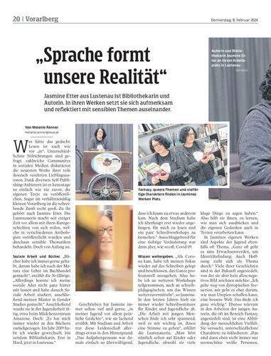 Jasmine Etter aus Lustenau ist Bibliothekarin und Autorin. In ihren Werken setzt sie sich aufmerksam und reflektiert mit sensiblen Themen auseinander.