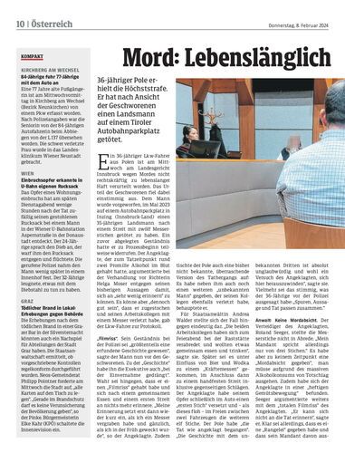 36-jähriger Pole erhielt die Höchststrafe. Er hat nach Ansicht der Geschworenen einen Landsmann auf einem Tiroler Autobahnparkplatz getötet.
