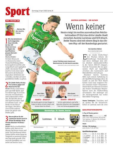 Heute steigt im restlos ausverkauften Reichshofstadion (17 Uhr) das dritte Ländle-Duell zwischen Austria Lustenau und SCR Altach. Beide Teams sind mit einem Sieg in das Untere Play-off der Bundesliga gestartet.