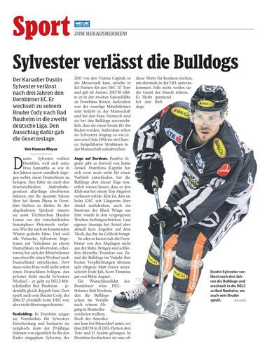 Der Kanadier Dustin Sylvester verlässt nach drei Jahren den Dornbirner EC. Er wechselt zu seinem Bruder Cody nach Bad Nauheim in die zweite deutsche Liga. Den Ausschlag dafür gab die Gesetzeslage.