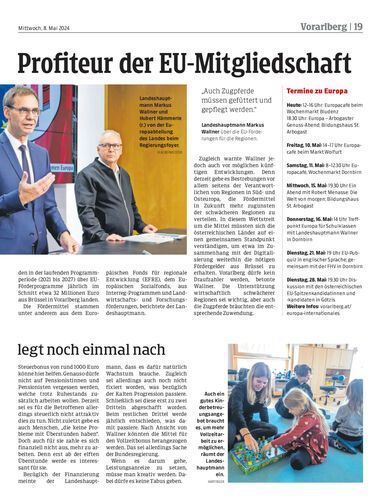 Rund 24 Millionen Euro fließen jährlich von Vorarlberg in Richtung EU. An Fördermitteln kommen jedoch rund 32 Millionen Euro pro Jahr zurück.