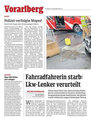 Fahrer eines Klein-Lkw übersah beim Einbiegen in Landesstraße in Frastanz auf Radweg entgegenkommende Radfahrerin, die getötet wurde: Geldstrafe wegen fahrlässiger Tötung.