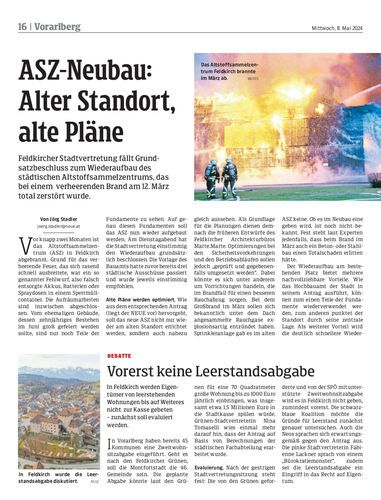 Feldkircher Stadtvertretung fällt Grundsatzbeschluss zum Wiederaufbau des städtischen Altstoffsammelzentrums, das bei einem verheerenden Brand am 12. März total zerstört wurde.
