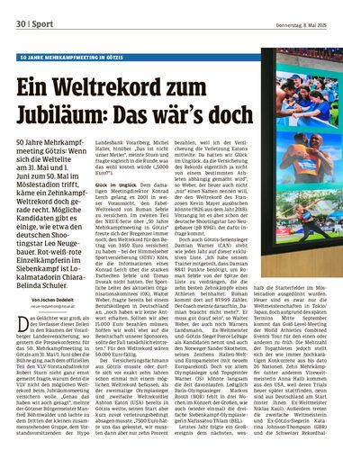 50 Jahre Mehrkampfmeeting Götzis: Wenn sich die Weltelite am 31. Mai und 1. Juni zum 50. Mal im Möslestadion trifft, käme ein Zehnkampf-Weltrekord doch gerade recht. Mögliche Kandidaten gibt es einige, wie etwa den deutschen Shootingstar Leo Neugebauer. Rot-weiß-rote Einzelkämpferin im Siebenkampf ist Lokalmatadorin Chiara-Belinda Schuler.