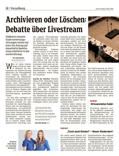 Feldkirch streamt Stadtvertretungssitzungen weiter nur kurz: Ein Antrag auf dauerhafte Speicherung scheiterte in der ersten Sitzung.