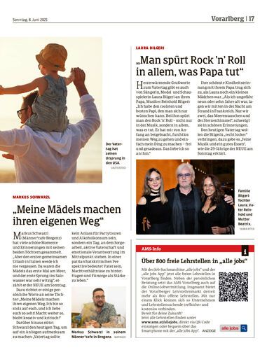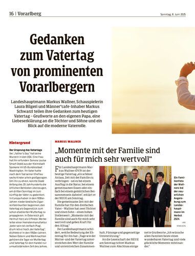 Landeshauptmann Markus Wallner, Schauspielerin Laura Bilgeri und Männer*cafe-Inhaber Markus Schwarzl teilen ihre Gedanken zum heutigen Vatertag – Grußworte an den eigenen Papa, eine Liebeserklärung an die Töchter und Söhne und ein Blick auf die moderne Vaterrolle.