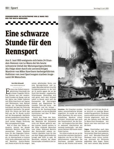Am 11. Juni 1955 ereignete sich beim 24-Stunden-Rennen von Le Mans der bis heute schwerste Unfall der Motorsportgeschichte. Als Folge einer durch ein unvorsichtiges Manöver von Mike Hawthorn herbeigeführten Kollision von zwei Sportwagen starben insgesamt 84 Menschen.