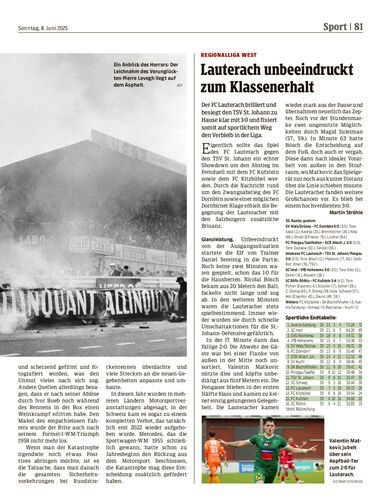 Der FC Lauterach brilliert und besiegt den TSV St. Johann zu Hause klar mit 3:0 und fixiert somit auf sportlichem Weg den Verbleib in der Liga.