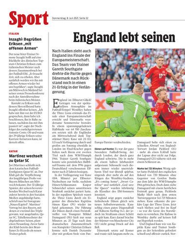 Nach Italien zieht auch England ins Finale der Europameisterschaft. Das Team von Trainer Gareth Southgate drehte die Partie gegen Dänemark nach Rückstand noch in einen 2:1-Erfolg in der Verlängerung.