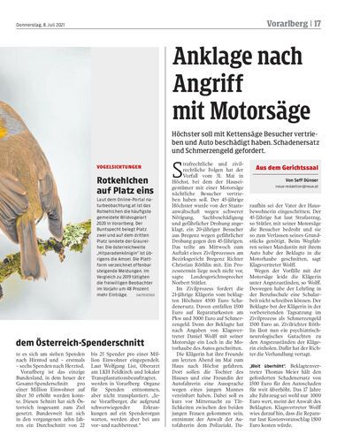 Höchster soll mit Kettensäge Besucher vertrieben und Auto beschädigt haben. Schadenersatz und Schmerzengeld gefordert.