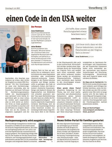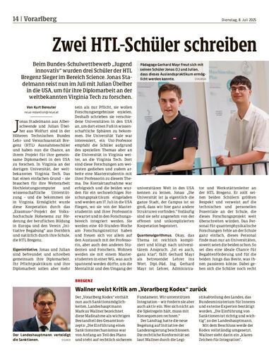 Beim Bundes-Schulwettbewerb „Jugend innovativ“ wurden drei Schüler der HTL Bregenz Sieger im Bereich Science. Jonas Stadelmann reist nun im Juli mit Julian Übelher in die USA, um für ihre Diplomarbeit an der weltbekannten Virginia Tech zu forschen.