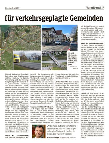 Vorarlberg beteiligt sich am europäischen Ideenwettbewerb. Im Fokus: Die Transformation an der L202. Im ersten Schritt geht es um Bewusstseinsbildung, zugleich soll der Wettbewerb auch die gemeindeübergreifende Zusammenarbeit stärken.