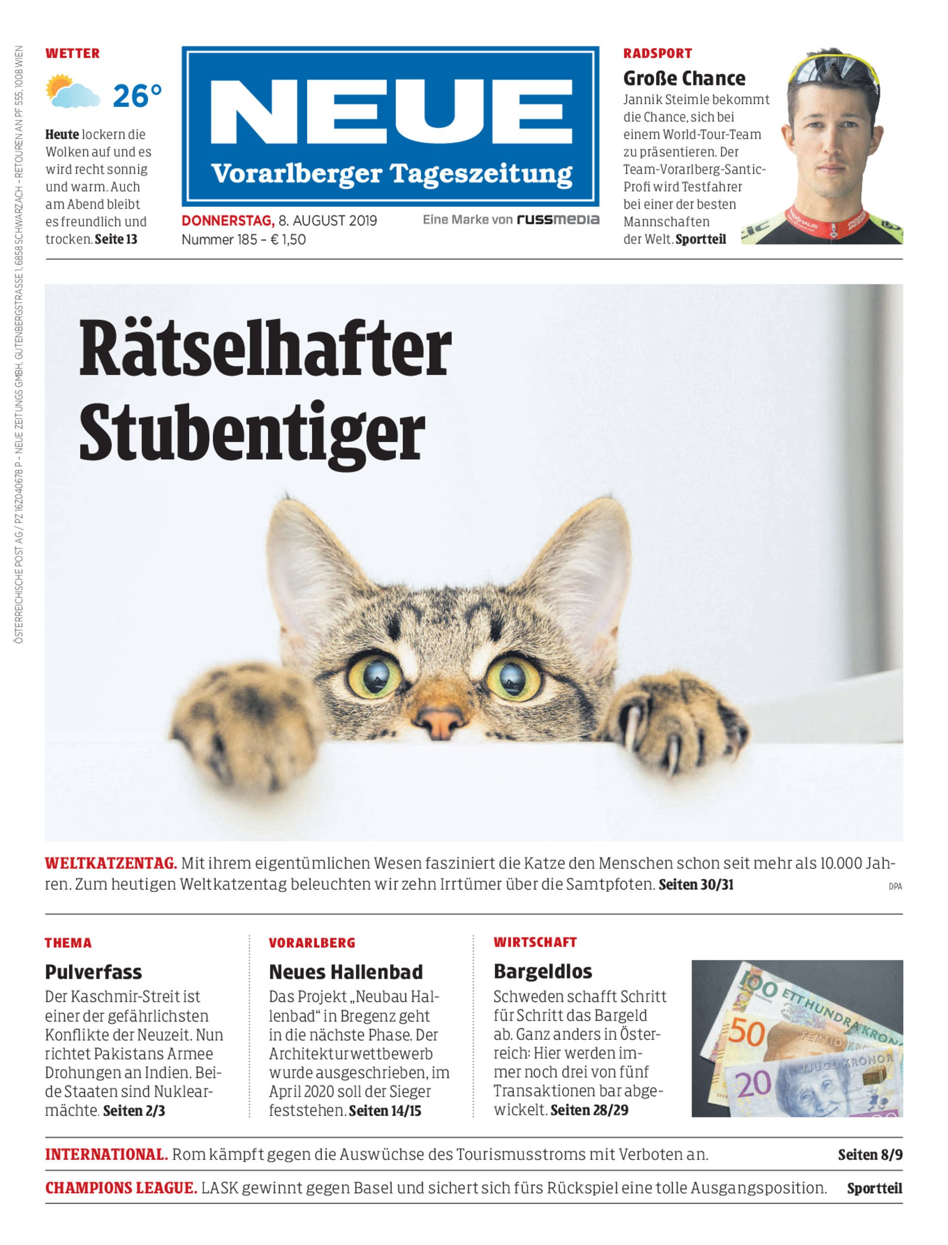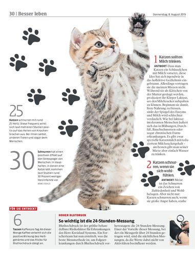 Weltkatzentag. Mit ihrem eigentümlichen Wesen fasziniert die Katze den Menschen schon seit mehr als 10.000 Jahren. Zum heutigen Weltkatzentag beleuchten wir zehn Irrtümer über die Samtpfoten. Seiten 30/31 DPA