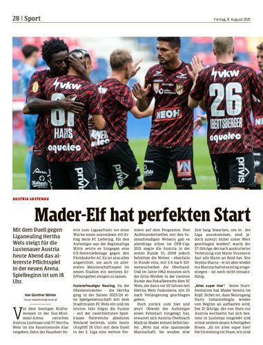 Mit dem Duell gegen Liganeuling Hertha Wels steigt für die Lustenauer Austria heute Abend das allererste Pflichtspiel in der neuen Arena. Spielbeginn ist um 18 Uhr.