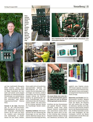 Die Brauerei Fohrenburger präsentiert ihre neue Abfüllanlage, eine leichte 0,33-Liter-Mehrwegflasche und die erste Zwölfer-Kiste Vorarlbergs.