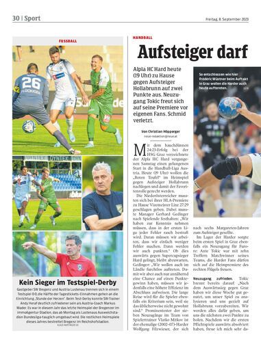 Alpla HC Hard heute (19 Uhr) zu Hause gegen Aufsteiger Hollabrunn auf zwei Punkte aus. Neuzugang Tokic freut sich auf seine Premiere vor eigenen Fans. Schmid verletzt.