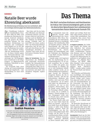 Die Kluft zwischen Kulturen und Kontinenten im Fokus: Der Literaturnobelpreis geht an den im deutschen Sprachraum fast unbekannten tansanischen Autor Abdulrazak Gurnah (72).