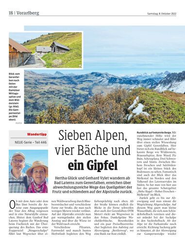 Hertha Glück und Gerhard Vylet wandern ab Bad Laterns zum Gerenfalben, erreichen über abwechslungsreiche Wege das Quellgebiet der Frutz und schlendern auf der Alpstraße zurück.