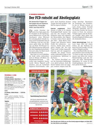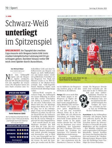 Spielbericht. Im Topspiel der zweiten Liga musste sich Bregenz beim GAK trotz starker kämpferischer Leistung mit 0:1 geschlagen geben. Darüber hinaus verlor SW noch zwei Spieler durch Ausschluss.