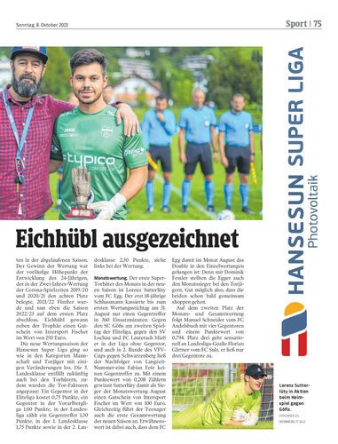 FC-Egg-Goalie Lorenz Sutterlüty hat in der Hansesun Super Liga bei den Torhütern die erste Monatswertung der neuen Saison gewonnen und der Super-Torhüter der Saison 2022/23 bekam den Pokal überreicht.