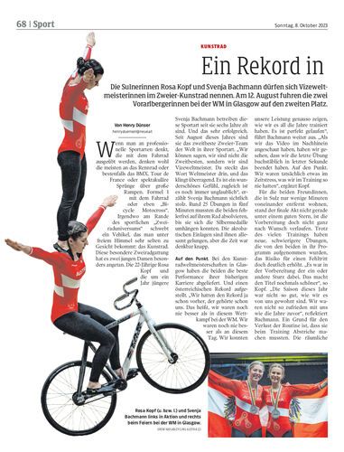Die Sulnerinnen Rosa Kopf und Svenja Bachmann dürfen sich Vizeweltmeisterinnen im Zweier-Kunstrad nennen. Am 12. August fuhren die zwei Vorarlbergerinnen bei der WM in Glasgow auf den zweiten Platz.