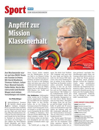 Am Wochenende wartet auf das ÖEHV-Team ein Turnier in Polen. Mit David Madlener, Thomas Vallant, Julian Payr, Manuel Ganahl, Fabio Hofer, Kevin Macierzynski und Daniel Woger sind sieben Vorarlberger mit dabei.
