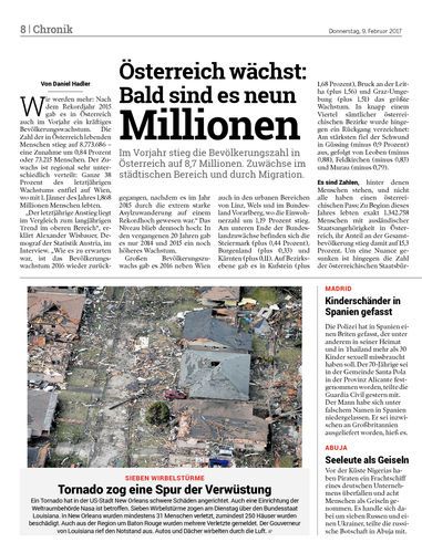 Im Vorjahr stieg die Bevölkerungszahl in Österreich auf 8,7 Millionen. Zuwächse im städtischen Bereich und durch Migration.