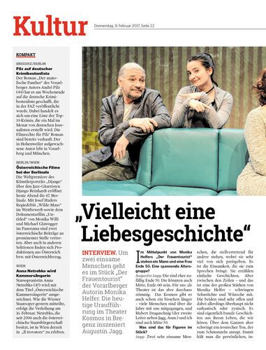 Interview. Um zwei einsame Menschen geht es im Stück „Der Frauentourist“ der Vorarlberger Autorin Monika Helfer. Die heutige Uraufführung im Theater Kosmos in Bregenz inszeniert Augustin Jagg.