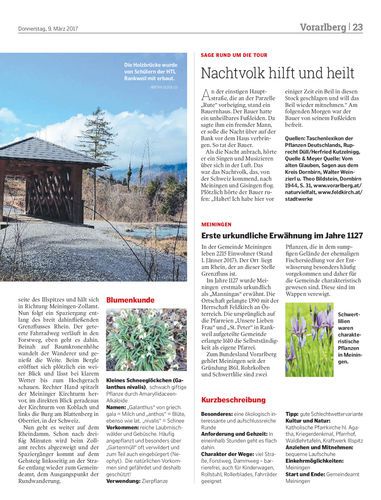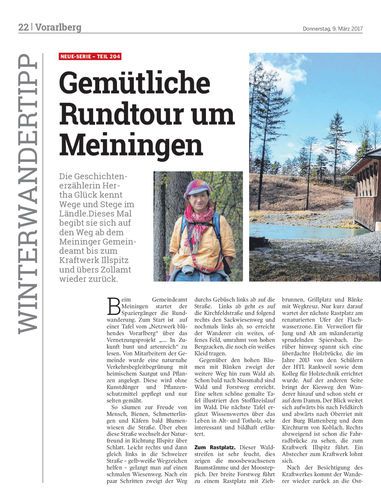 Die Geschichtenerzählerin Hertha Glück kennt Wege und Stege im Ländle.Dieses Mal begibt sie sich auf den Weg ab dem Meininger Gemeindeamt bis zum Kraftwerk Illspitz und übers Zollamt wieder zurück.